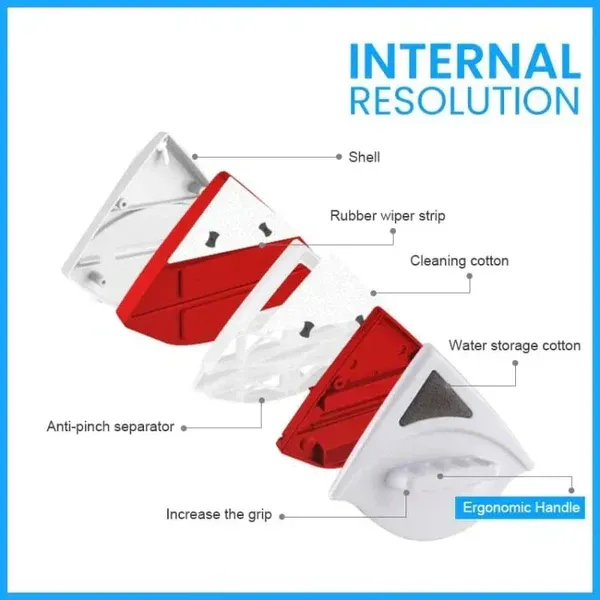 Magnetischer Glasreiniger mit dreieckiger Form, der den schmalen Bereich des Fensters reinigenkann und keine toten Ecken hinterlässt. Der eingebaute Wasserspeicherschwamm kann lange Zeit verwendet werden, wodurch ein wiederholtes Nachfüllen von Wasser vermieden wird und er einfach zu benutzen ist. Darüber hinaus können die Reinigungswatte, das Reinigungstuch und die feste Schnalle ausgetauscht werden.